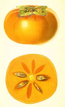 The persimmon is a fruit that has fallen out of fashion for its poor keeping qualities. There are two main types, the tall Hachiya type and the short squat Fuyu type. Choose persimmons that are very soft but not mushy, and be very careful not to bruise them.