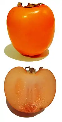 - Fuyu: This persimmon is gaining popularity here as it is in Japan. Similar in color, but looking like a squashed tomato, this variety is smaller, sweeter, and is edible while still firm.