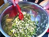 Pot Stickers or Jiaozi are traditional Chinese dumplings that are both fried and steamed. You can use whatever filling you like. Pork is traditional, but there are many versions. Any meat should be thoroughly cooked, and all ingredients should be sliced very small. For the example shown, garlic and ginger was cooked in oil, and then asparagus and tofu were cooked with the oil. These instructions show how to assemble the pot stickers once the filling is ready.