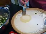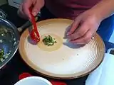 Step 2: Brush a gyoza wrapper with a little water around the edges.