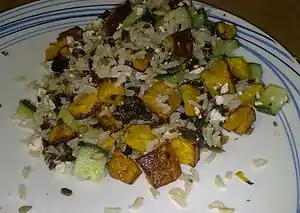- Stir through rice, butternut, bilton, roasted seeds, cucumber, feta and herbs
