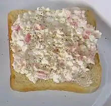 The basic filling consists of about 50/50 mayonnaise and cottage cheese. The proportions can be varied by taste. For a low fat version use more cottage cheese and/or substitute the mayonnaise for low-fat (do not use non-fat) mayonnaise. Different flavorings can be added to the basic filling, some examples follow.