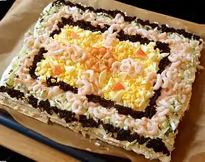 "Sandwich cake" ("Sandwich layer-cake" is an English language description rather than a translation of the Swedish name) is a typical Swedish party dish, not to be confused with Smörgåsbord. The sandwich cake is a very rich sandwich with so much filling it resembles a cake. The sandwich cake is excellent for receptions and parties since it is served cold and can be prepared in advance. It is also possible to have great variation in the fillings to accompany most peoples taste. The dish can be served as a cake or in smaller piece as appetizers.