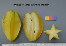 The star fruit, sometimes called the carambola or star apple, is a tropical fruit that is gaining popularity. This fruit acquired its name from the five pointed star shape when cut across the middle of the fruit. It has a waxy, golden yellow to green color skin with a complicated flavor combination that includes plums, pineapples, and lemons. It is usually quite sour.