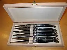 Steak knife is the term for small knives used at the table for eating. It is about the size of a butter knife but is sharpened and usually serrated for more effectiveness when cutting through tough, meaty samples. It is important that any knives are kept sharp, as blunt knives require more force to use, actually increasing the likelihood of injury (cuts from a sharp knife heal more quickly than those from a blunt one). A knife sharpener can be used to keep knives sharp.
