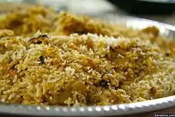 Thalassery biriyani ( t̪laʃeɾi biɾijɑːɳi ) is a rice dish blended with Chicken and Spices. The recipe has a strong legacy of the Mughlai cuisine. This variant of biryani is an Indian cuisine and has originated from the Malabar region of South India. [2] The specialty is the difference in the choice of rice (Basmati rice is not used; small-grained Khaima/Jeerakasala rice is used); Chicken is not fried before adding to the masala. Thalassery biryani is a Pakki biryani where as Hyderabadi is a Kacchi biryani and therefore apparently a dum biryani. There are clear distinctions of taste between Thalassery biryani and other biryani variants.[2]