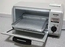 Toaster ovens are small-scale conventional ovens and can be used to cook foods other than just toasting. A frontal door is opened, horizontally-oriented bread slices (or other food items) are placed on a rack which has heat elements above and below it, and the door is closed. The controls are set and actuated to toast the bread to the desired doneness, whereupon the heat elements are switched off. In most cases the door must be opened manually, though there are also toaster ovens with doors that open automatically. Because the bread is horizontal, a toaster oven can be used to cook toast with toppings, like garlic bread, melt sandwiches, or toasted cheese. Toaster ovens are generally slower to make toast than pop-up toasters, taking 4–6 minutes as compared to 2–3 minutes. In addition to the automatic-toasting settings, toaster ovens typically have settings and temperature controls to allow use of the appliance as a small oven.