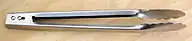 Cooking and serving tongs consist of shaped "jaws" attached to a pair of long handles equipped with a spring to open or 'release' them. The 'scissor' style with looped handles and smaller loops on the 'food' end is also popular.