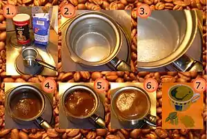 A common variation in the Arab world is allowing the brew to boil, the pot removed from the heat source just before it boils over, allowing it to settle, and then repeating the process two or three times. This results in even stronger and more concentrated coffee.
