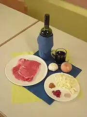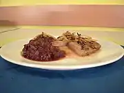 My recipe, however, uses a red-wine onion gravy and is adapted from a recipe that was published in a cooking magazine[1] . The magazine's recipe uses a lot of butter during the cooking process, which raises the calorie intake per serving considerably. This recipe is a reduced-calorie version of the original, but nevertheless a flavorful one. The butter, if not left out entirely, can be replaced by healthier vegetable oil. There are no measurements in the recipe telling you how much oil should be used, but in practice, the least possible amount has worked out well without sacrificing the taste. This way, the meal can be enjoyed without having to worry about rising cholesterol levels. The meat juices mentioned above are also used in the cooking process and so their intense flavor will not go to waste.