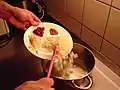 For the topping, cut about half an onion into thin onion rings. Add them to the juices remaining from the meat and let them soak up the delicious flavor. Depending on how much oil and juices there are still left in the frying pan, you might have to add some oil or water in order to let the onions absorb the flavor properly.