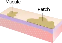 - Patch: A patch is a large macule equal to or greater than either 5 or 10 mm across,[30] depending on one's definition of a macule.[1] Patches may have some subtle surface change, such as a fine scale or wrinkling, but although the consistency of the surface is changed, the lesion itself is not palpable.[29]