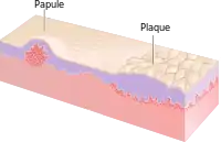 - Plaque: A plaque has been described as a broad papule, or confluence of papules equal to or greater than 10 mm,[30] or alternatively as an elevated, plateau-like lesion that is greater in its diameter than in its depth.[29]