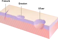 - Fissure: A fissure is a crack in the skin that is usually narrow but deep.[29][34]