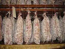 Salt serves four main purposes in the preservation of food in the charcuterie kitchen. The first is inducing osmosis: This process involves the movement of water outside of the membranes of the cells, which in turn reabsorb the salted water back into the cell. This process assists in the destruction of harmful pathogens. The second is dehydration, which means the salt pulls excess water from the protein, which aids in the shelf life of the protein, as there is less moisture present for bacterial growth. Fermentation is the third, in which salt assists in halting the fermentation process which would otherwise completely break the meat down. Finally, salt assists in denaturing proteins, which in essence means the structure of the proteins is effectively shifted, similar to the effects of cooking.[8]