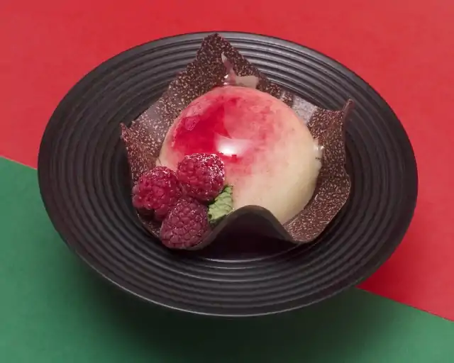 A formal custard preparation, garnished with raspberries