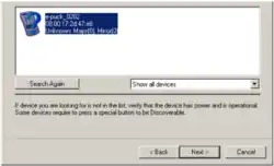 The second window searches all the visible Bluetooth devices. After a time, an icon representing your e-puck must appear. Select it and click on the Next button.