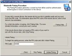 This action opens the security window. Here you have to choose four digits for securing the connection. Choose the same number as your e-puck (if your e-puck is called ”e-puck_0202”, choose 0202 as PIN) and click on the Initiate Paring button.