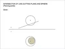 We can use the above construction to figure out the piercing points of a line and a sphere. To do so, we assume that the line in one of the two views is the edge view of the cutting plane (section plane). (Fig2.2)
