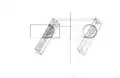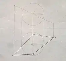1. In front view, select two points on the given line and draw two lines that are parallel to the axis through these points. 2. Mark the points at which these two lines intersect the edge view of the base of the cylinder. Project these points to the top view until they hit the base. 3. Draw lines parallel to the axis, to the other base of the cylinder. 4. Where these two lines intersect the given line are the two piercing points.