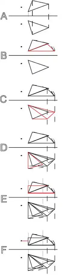 - Step B ) Rotate this line in one of the views (of your choice, here the top view is used), so that the line is parallel to the folding line. Rotate the last point over as well. (See Rotating a Plane for further instructions).