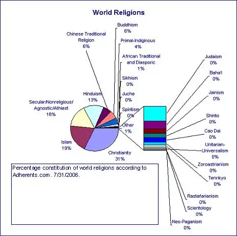 The above graphic shows the major world religions by percentage adherence with the least eleven broken out. The data was taken from Adherents.com, July 31, 2006. Obviously, many religions are left out.