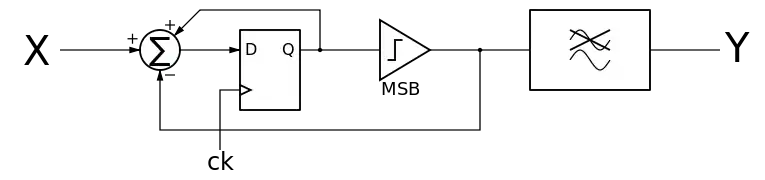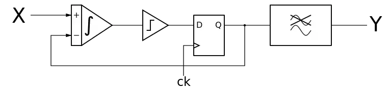 The function of this circuit is very similar to the one of the analog modulator. Here too, the output is a bit stream and a full-fledged analog signal requires a lowpass filter to reconstruct a copy of the original digital input signal.