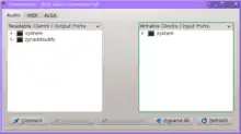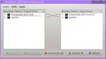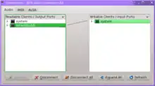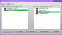 Also click the “Connect” button, and another window will appear, showing the connections between JACK client applications. This will have 3 tabs, labelled “Audio”, “MIDI”, and “ALSA”. The “Audio” tab will show the connections for routing audio data, while the “MIDI” and “ALSA” tabs will show two different kinds of connections for routing MIDI data. Applications that use ALSA calls to manage their MIDI interfaces will show up under the “ALSA” tab, while those that use native JACK calls will show up under “MIDI”.