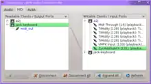 However, for music production work, we need to bring JACK into the equation. This gives us a “patchbay”, where we can see “ports” exposed by the different music and audio applications we have running (and system hardware we have available), and run virtual “wires” between these ports to make connections for both audio and control data.