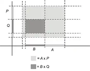 Finally, when we represent the set B × Q as a rectangle whose limits are determined by the limits of B and Q, it is clear that this rectangle will lie within the rectangle representing A × P:
