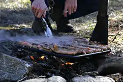 Another traditional campfire activity involves impaling marshmallows on sticks or uncoiled coat hangers, and roasting them over the fire. Roasted marshmallows may also be used for S'mores.