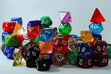 Within the game rules, die rolls are typically abbreviated in the form of XdY, where X is the number of that type of die, and Y is (normally) the number of sides on the polygonal dice. The seven polygonal dice used are 4, 6, 8, 10, 12 and 20. Hence, a 2d6 roll is made by rolling two six-sided dice and adding up the total results. Other numbers typically used for Y are: 2, 3, and %. d2 is rolling the d6 and dividing by 3, d3 is the same except divided by 2; both times you round up. The percentile dice, or d%, is found by rolling two d10 dice. In this case, a special 1d10 is sometimes used that has faces numbered 00, 10, 20, 30, 40, 50, 60, 70, 80, and 90.