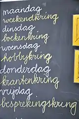 | het krijt - chalk | het lezen - reading | het schrijven - writing | het rekenen - arithmetic | de wiskunde (v.) - mathematics |