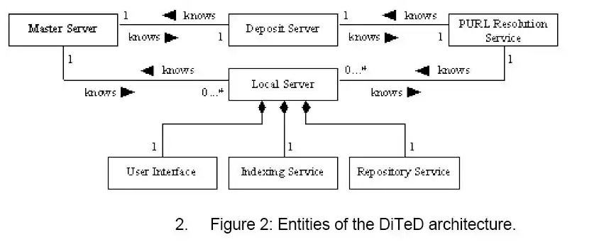 Each thesis or dissertation deposited in DiTeD automatically receives a URN [4], which will be registered and managed by a namespace and resolution service. This is in fact a simple implementation of the concept of PURL - Persistent URL, with the particular property that it resolves any PURL by returning its real URL in the original Local Server, unless it is not available anymore. In this case, it resolves it by returning its URL in the Deposit Server. The entities of this final DiTeD architecture are shown in Figure 2.