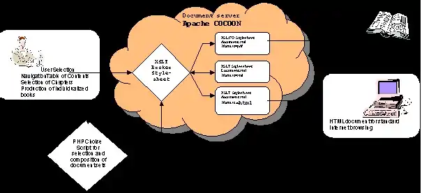 For the printing on demand component with XML the usage of Apache/Cocoon was chosen. This software uses an XSLT-engine to produce an HTML or PDF-Version on the fly. "The Cocoon Project is an Open Source volunteer project under the auspices of the Apache Software Foundation (ASF), and, in harmony with the Apache webserver itself, it is released under a very open license. Even if the most common use of Cocoon is the automatic creation of HTML through the processing of statically or dynamically generated XML files, Cocoon is also able to perform more sophisticated formatting, such as XSL:FO rendering to PDF files, client-dependent transformations such as WML formatting for WAP-enabled devices, or direct XML serving to XML and XSL aware clients. "
