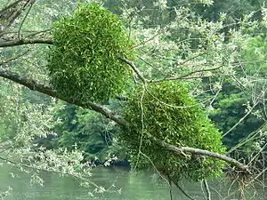 Numerous mosses and lichens are also considered epiphytes and another common epiphyte at Christmas is Mistletoe. Mistletoe is one of the epiphytes that can be harmful to its host. The berries from mistletoe are covered with a sticky laxative coating and are spread by birds. These seeds develop haustorium when germination begins and penetrate the bark of young trees. Lethal infections can subsequently occur.