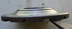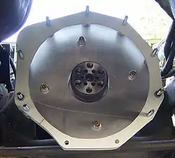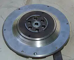 For vehicles using a manual transmission, the motor drives a flywheel, a large disk. For the electric vehicle conversion the flywheel is needed only to mount the clutch, if a cluch is used at all. The outer rim of this disk will have a gear ring shrunk or welded on, intended to be driven by the starter gear. The after face of the flywheel mounts the clutch and forms one face of the two surfaces driving the clutch disk. The flywheel will have substantial weight to allow the ICE motor to idle smothly at low speed. Rarely, this flywheel may have been balanced as a unit with the crankshaft, in which case it may be considerably out of balance for this new application. The extra weight required for ICE smoothness reduces acceleration and the energy to spin it cannot be easily recovered, adding to brake wear. For these reasons it is appropriate to lighten and balance the flywheel, which is done with specialized tools at an automotive machine shop. This may be lighted considerably more than is the case for ICE performance enhancement. Further, the starter ring is no longer used so it may be removed for a further weight saving except where this contributes to flywheel strength. Do not remove so much material that the flywheel becomes weak. Weight removed at the periphery will be more effective in enhancing performance and will also reduce loading on the inner portion, which may be made correspondingly light. If the outer portion that contains the treads for the pressure plate mounting screws is thinned excessively it will be necessary to use nuts to secure the bolts that hold the pressure plate to the flywheel. In this case it must be possible to access these nuts in some way in order to complete the assembly of the components. An appropriate access port in the forward face of the central transfer plate should be provided, or an access from the side via a penetration of the cylindrical dust shrouds.
