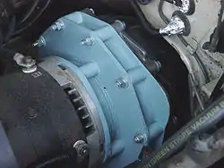 The adapter is the blue object between the motor and the transmission