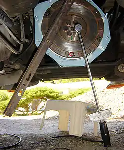Angle iron (cut from part of a bedframe) bolted to the flywheel to prevent rotation when bolts are torqued.
