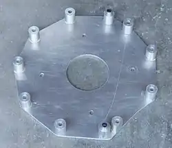 The adapter plate provides the union between the electric motor and the transmission. Some installations such as for the Volkswagen Beetle and similar use such a simple machined adapter that it is easily obtained at low cost from a commercial supplier. Adapters for more complex or less popular vehicles may be quite expensive. It is possible for the builder to construct such a plate using simple tools as outlined below, but a great precision in layout and fabrication is required. For this reason most converters purchase an adapter plate and coupling as a package from a specialty converter or have the plate fabricated by a professional machinist. If a flat plate is used, some means of properly spacing it must be employed, typically by using hollow tubular or billet stand-offs. More common will be the use of a stack of flat plates, forming an adaption between the large diameter of the flywheel and the smaller diameter of the motor, with interior volume to accommodate any projection of the flywheel forward of the face of the transmission (or bell housing if a separate unit is used).