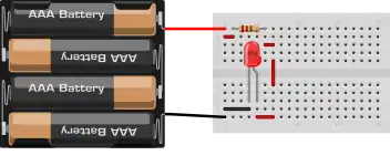 Due to LEDs being somewhat sensitive to over-voltage (or, too much power being fed in), we must also use a resistor to reduce the voltage supply at the LED anode. This will be explained.
