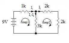 The circuit has 2 loops indicated on the diagram. Using KVL we get: