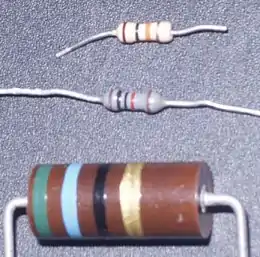 Color 1st band 2nd band 3rd band Multiplier Tolerance Temp. Coefficient Black 0 0 0 ×100 Brown 1 1 1 ×101 ±1% (F) 100 ppm Red 2 2 2 ×102 ±2% (G) 50 ppm Orange 3 3 3 ×103 15 ppm Yellow 4 4 4 ×104 25 ppm Green 5 5 5 ×105 ±0.5% (D) Blue 6 6 6 ×106 ±0.25% (C) Violet 7 7 7 ×107 ±0.1% (B) Gray 8 8 8 ×108 ±0.05% (A) White 9 9 9 ×109 Gold ×0.1 (10−1) ±5% (J) Silver ×0.01 (10−2) ±10% (K) None ±20% (M)