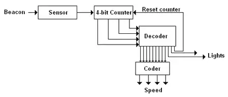 Each time the wheel senses a magnetic signal from the railway, a counter is incremented with one unity. In this way every beacon has a corresponding counter's output. A logic circuit decodes this counter output. A programmable logic controller (PLC) provides a robust implementation. Figure 6 shows a possible implementation of the CPU. For a trajectory with sixteen beacons a 4-bit counter is sufficient. The decoder contains the necessary information to give the right command each time a beacon signal arrives. A speed signal goes to the control loop subsystem or a signal is sent to the light controller.