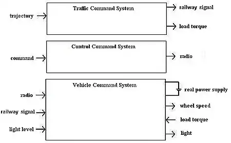 Each part has a couple of inputs and outputs, represented by arrows in figure 1. The traffic command system for example gets information from beacons placed along the railroad and from the slopes themselves. These beacons indicate a change in speed of the peoplemover. A map of the railroad together with the meaning of each beacon has to be loaded into the memory of the peoplemover before the vehicle can drive on the railroad. A sensor on the vehicle detects the beacons and reacts as indicated on the map. The slopes result in a certain load torque. The inputs and outputs of the other parts are indicated on figure 1. Figure 2 describes the content of each part in more detail.