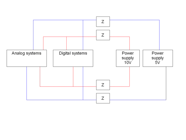 Between any two conductors in a system, there exists a capacitance if the space between them is filled with a dielectric insulator. If the receiving circuit has a large resistive impedance, the related noise signal is affected by the noise signal of the source. This effect is more important at high frequencies. To avoid this electrostatic coupling, the best method is to use an electrostatic shield. In this way the entire circuit is enclosed by a metal screen. From the principle of the 'Faraday cage' follows that the influence of external voltages will be zero inside the shield. A problem is that there will be a stray capacitance from this shield to every conductor within. This reduces its effectiveness. It is clear that this problem will not occur when the digital and analog grounds are kept separate.