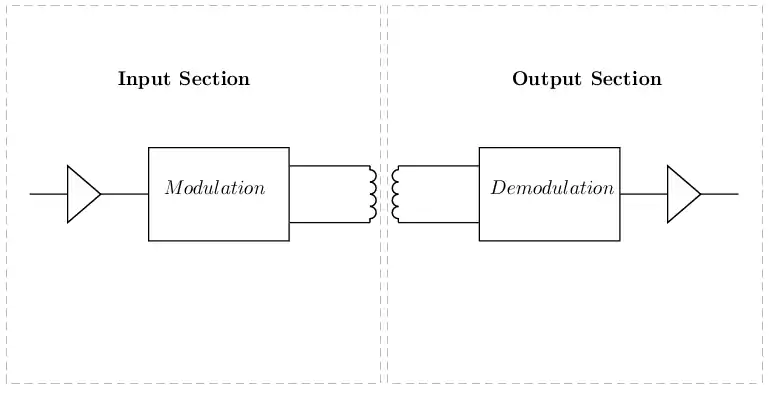 When optical isolation is used, the transmitted signal is first modulated and then send by a solid-state photo emitter to the photo detector of the second circuit. This way, both circuits are completely electrically decoupled. But this approach requires a battery to be included in the emitting circuit.