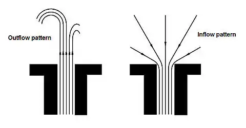 - Jet driven streaming: Periodic suction and ejection of a viscous fluid through an orifice or a change in cross section. The mechanism relies on the fact that a viscous fluid behaves quite differently during the suction and ejection periods. During the suction period the flow comes from all kind of directions, whilst during the ejection period a jet is produced. In Figure 2, the outflow and inflow patterns at the transition between a small tube and open space are shown. These two outflows can be regarded as the superposition of a broadly distributed oscillating flow and a time-averaged toroidal circulation.