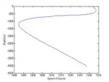 The speed of sound is very sensible to the temperature, which changes considerably on the thermocline . Beyond 1000 m meters in depth, the pressure governs the equation, increasing slowly the speed with depth. The salinity has very low effect on the equation unless in very specific situations, such as heavy rain or the encounter between a river and the sea. The shape of the curve may change drastically from one place to another, e.g., the curve would be more like a linear function of depth in very cold places.