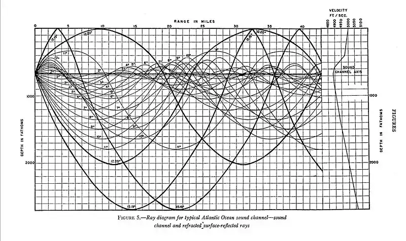 This process happens over and over again causing the sound to be trapped in certain depth range known as SOFAR (Sound Fixing and Ranging) channel . As the sound cannot reach the bottom nor the surface, the losses are small and no sound is transmitted to the air nor the seabed, helping sound propagate through large distances. Signals have been detected in ranges that exceed 3000 km.